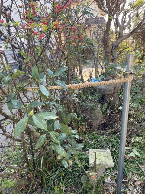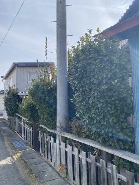 道路側に傾いているため単管を打ち込み縄ロープにて